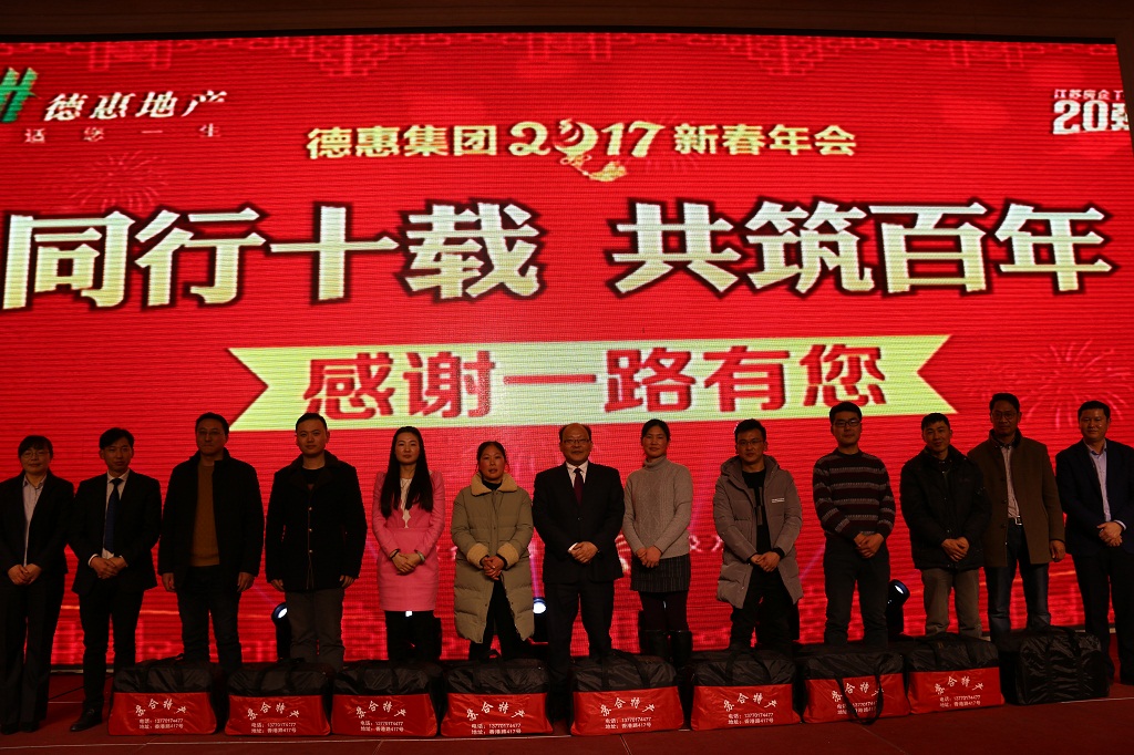 2017年1月21日,江蘇德惠集團(tuán)“同行十載,共筑百年——感謝一路有您”新春年會(huì)在天鵝湖國(guó)際大酒店盛大舉辦。當(dāng)晚蒞臨現(xiàn)場(chǎng)的嘉賓有江蘇德實(shí)投資發(fā)展有限公司張二干董事長(zhǎng)一行,興業(yè)建工集團(tuán)有限公司伍迎國(guó)董事長(zhǎng)一行,阜寧建筑設(shè)計(jì)院倪朝陽(yáng)院長(zhǎng),蘇州六度設(shè)計(jì)院蔣光中院長(zhǎng)一行,日升昌生物技術(shù)公司馬興旺董事長(zhǎng)一行,江蘇眾拓建材有限公司瞿學(xué)松董事長(zhǎng)一行,以及其他特邀嘉賓,優(yōu)秀經(jīng)紀(jì)人代表、老帶新代表,物管會(huì)成員和優(yōu)秀業(yè)主代表,德惠集團(tuán)員工家屬代表、優(yōu)秀學(xué)子代表等,與集團(tuán)員工代表共計(jì)500余人一起用掌聲、笑聲、歡呼聲迎接新年的到來(lái) 。