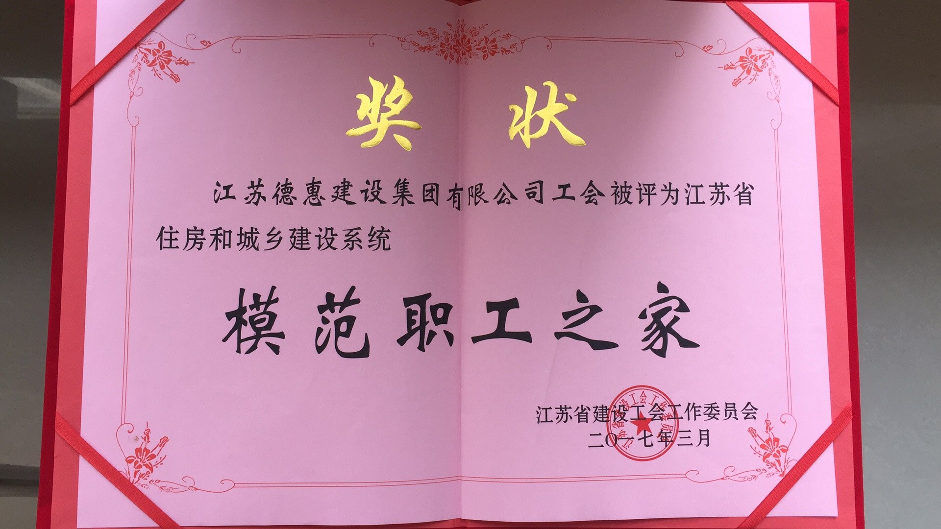 熱烈祝賀江蘇德惠建設(shè)集團(tuán)有限公司工會被評為江蘇省住房和城鄉(xiāng)建設(shè)系統(tǒng)“模范職工之家”榮譽稱號?。。?/h1>